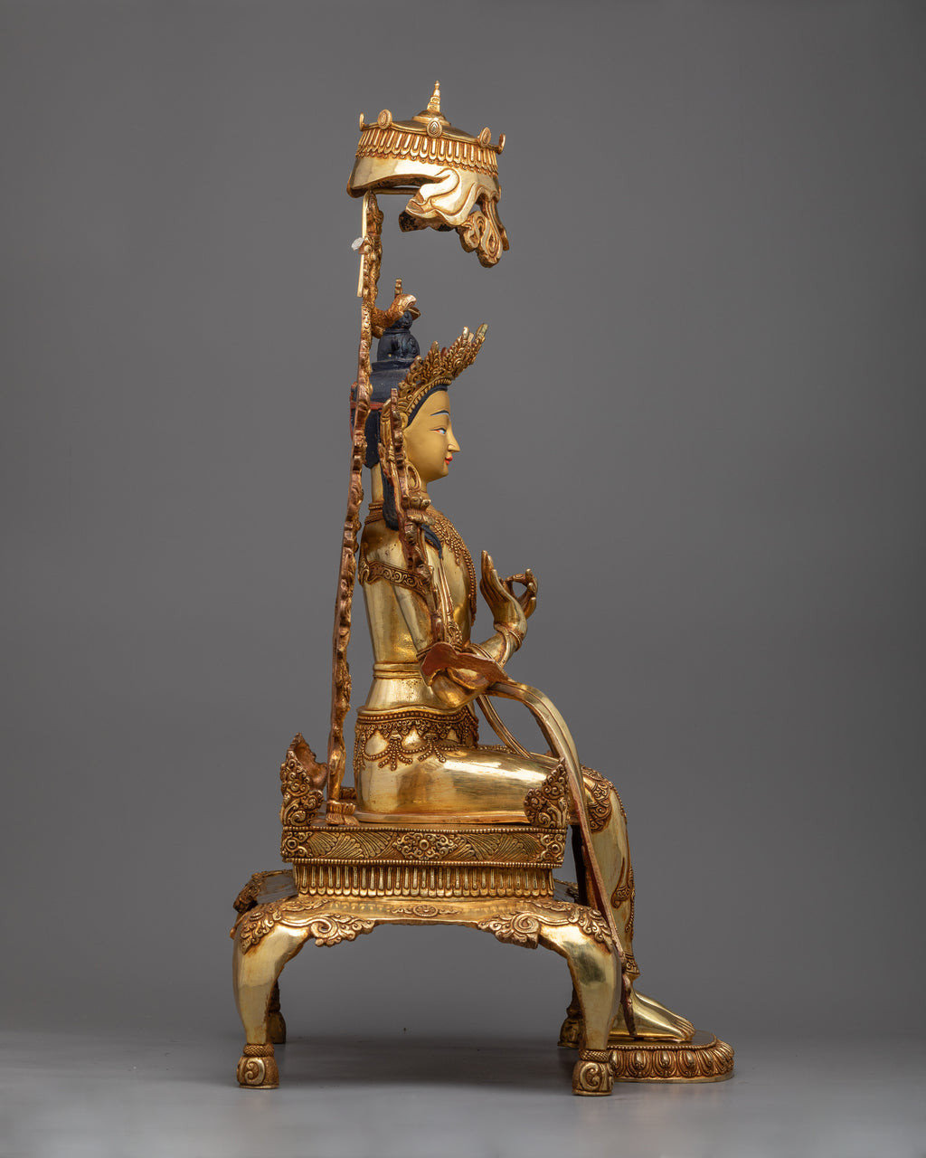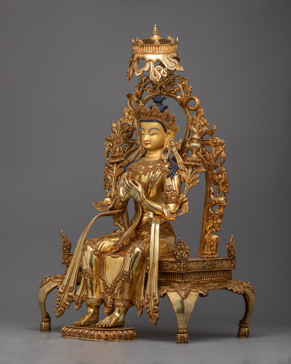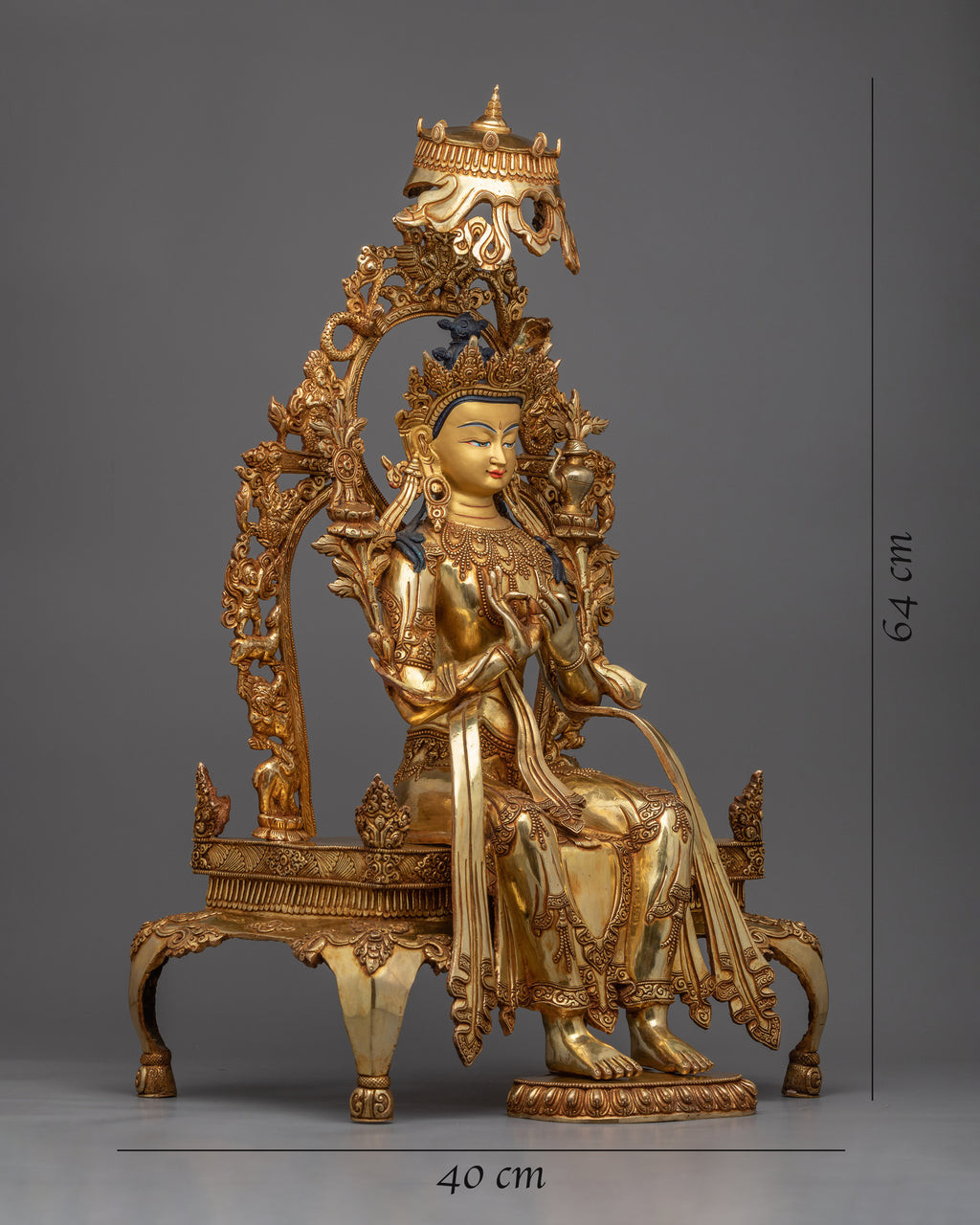 Each detail of this monument is a tribute to our Nepalese artists' remarkable talent and spiritual dedication. The copper body is lavishly gilded in 24k gold, and additional 24k gold and acrylic paints enhance to its visual attractiveness. The statue's beauty exudes enlightenment, representing Maitreya Buddha's teachings and infusing your environment with an air of peace and future wealth.