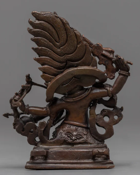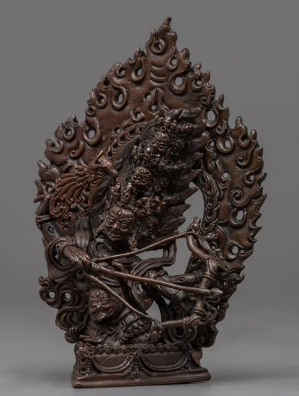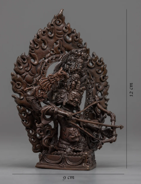 The machine-made Rahula statue is an oxidized copper sculpture of the deity Rahula one of the three treasure protectors. In the statue, the deity has multiple heads and is holding a bow and an arrow representing his power to bind and subdue negative forces. The deity is surrounded by a fiery halo that compliments his wrathful appearance.